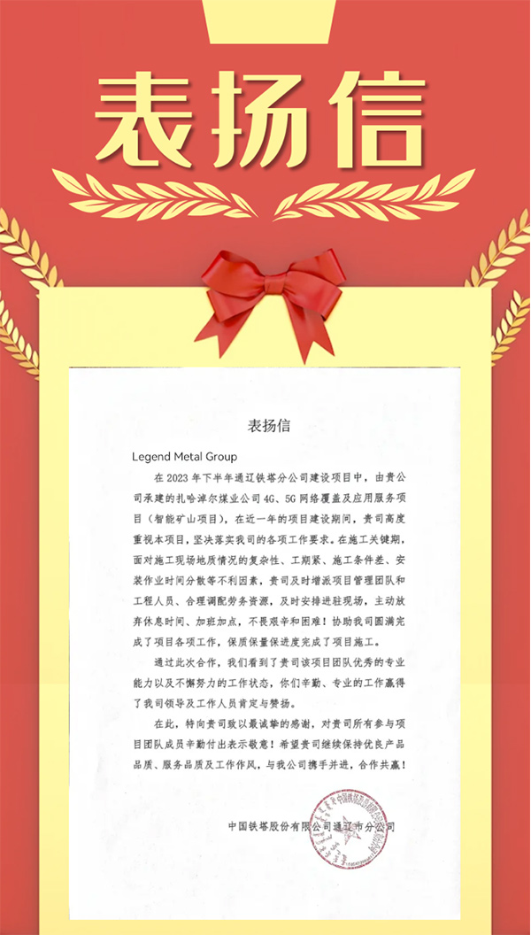 During the 2023 second half Tongliao Tower Branch construction project, your company undertook the 4G and 5G network coverage and application service project for Zaha Naoer Coal Industry (Smart Mine Project). Over nearly a year of construction, your team demonstrated exceptional dedication, fully implementing our requirements.